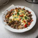 A comforting low carb twist on the classic Philly cheesesteak casserole, combining seasoned ground beef, bell peppers, and creamy cheeses.