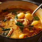 A comforting soup combining tender chicken, creamy broth, and gnocchi, perfect for sharing love and warmth with family.