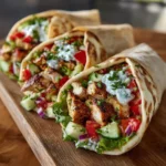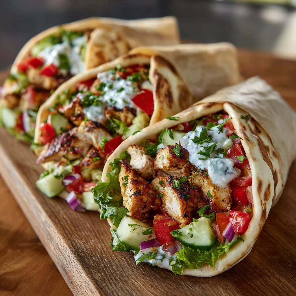 Delicious Mediterranean chicken gyros with marinated chicken, fresh vegetables, and creamy feta tzatziki sauce.