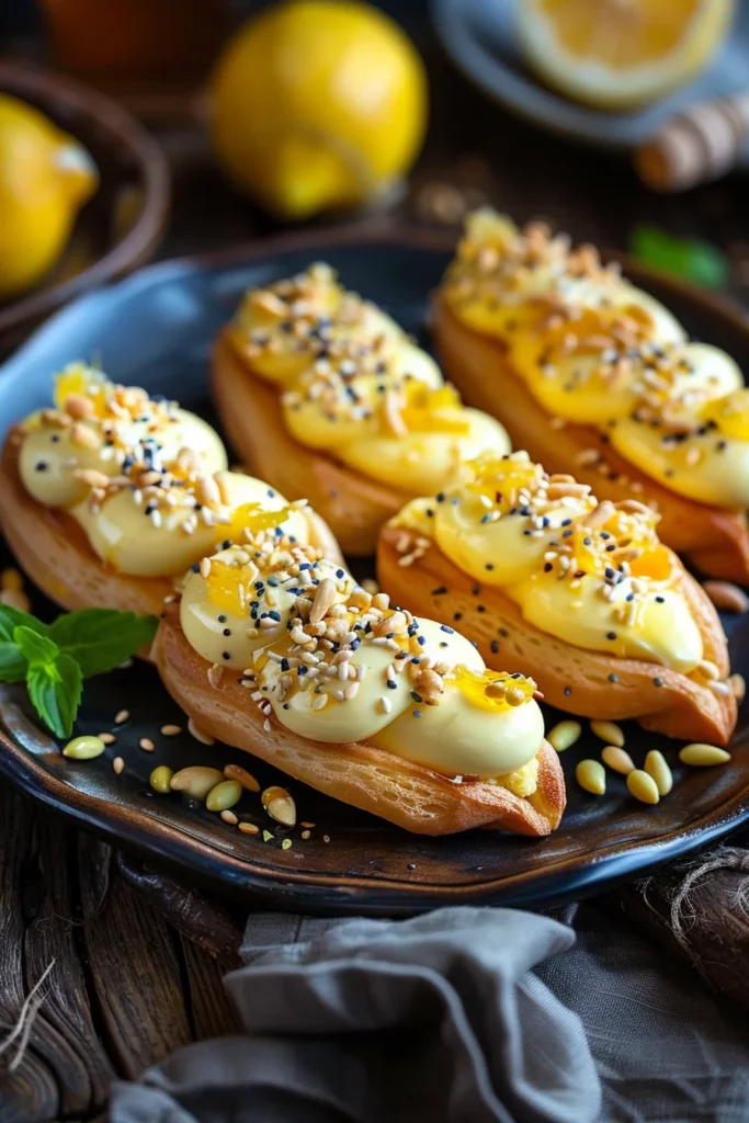 These éclairs are not just any dessert; they’re a celebration of vibrant flavors and textures. The seed crunch topping adds a delightful contrast to the creamy filling, making each bite a unique experience. It’s the kind of treat that brings people together, sparking conversations and creating cherished memories around the table.
