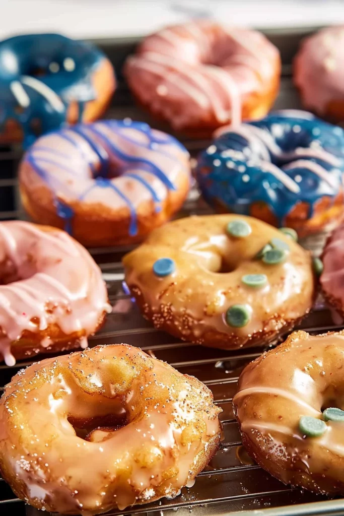 - After the donuts have cooled, prepare the glaze by mixing the powdered sugar with vanilla extract and milk. If desired, incorporate a few drops of food coloring for added effect.