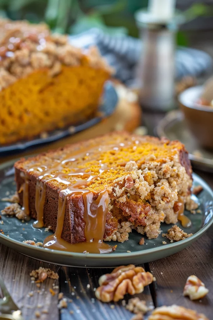 When it comes to serving your moist pumpkin bread with streusel topping and maple glaze, presentation is key. Slice the bread into thick, even pieces, showcasing the swirl of spices and the golden streusel on top. The glaze adds a glossy finish that makes each slice look irresistible.