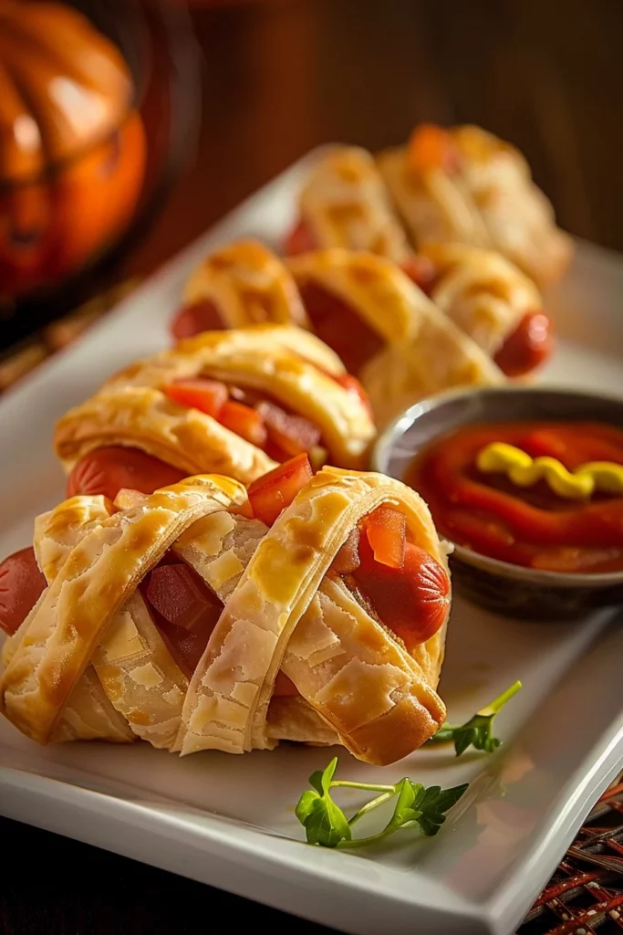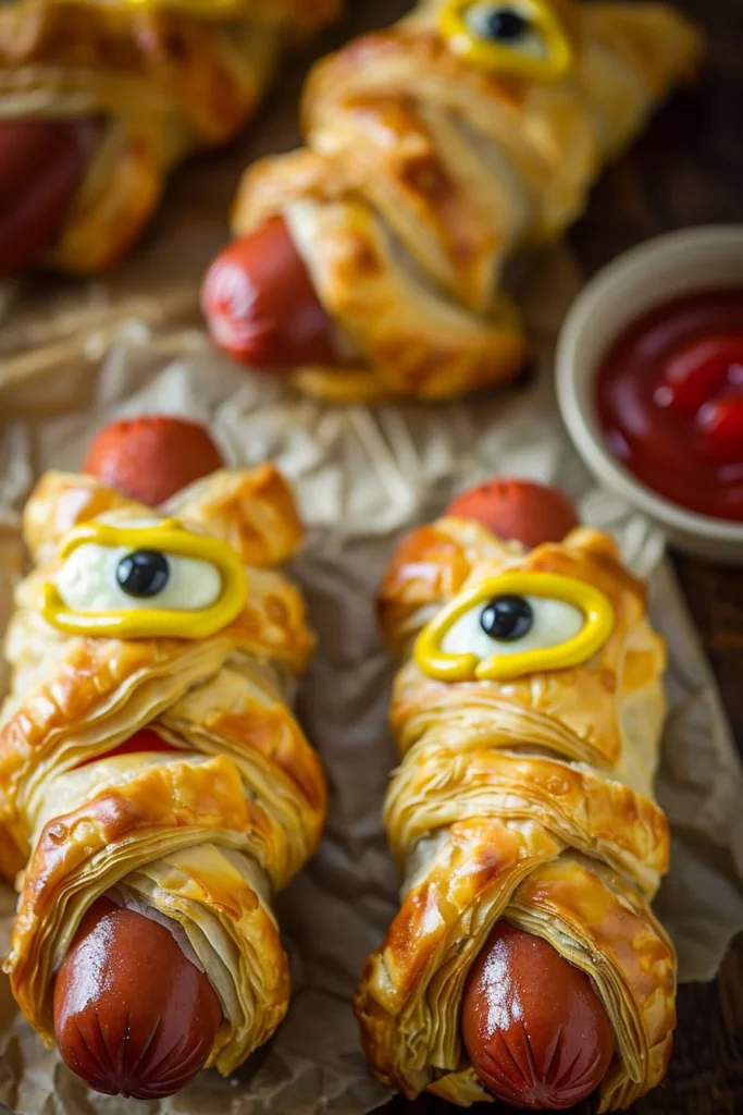 The combination of flaky puff pastry and savory hot dogs, accented by the playful mustard eyes, ensures these treats will be a hit with guests of all ages. Whether you enjoy them as a nostalgic nod to childhood memories or as a new addition to your culinary repertoire, Mummy Hot Dogs With Mustard Eyes deliver on both taste and fun.
