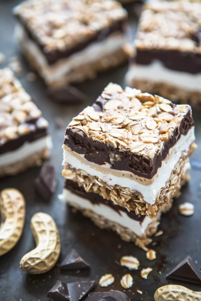 Keywords: 1. Peanut Butter Bars, 2. Chocolate Oatmeal Bars, 3. Greek Yogurt Filling, 4. No-Bake Dessert, 5. Sandwich Bars