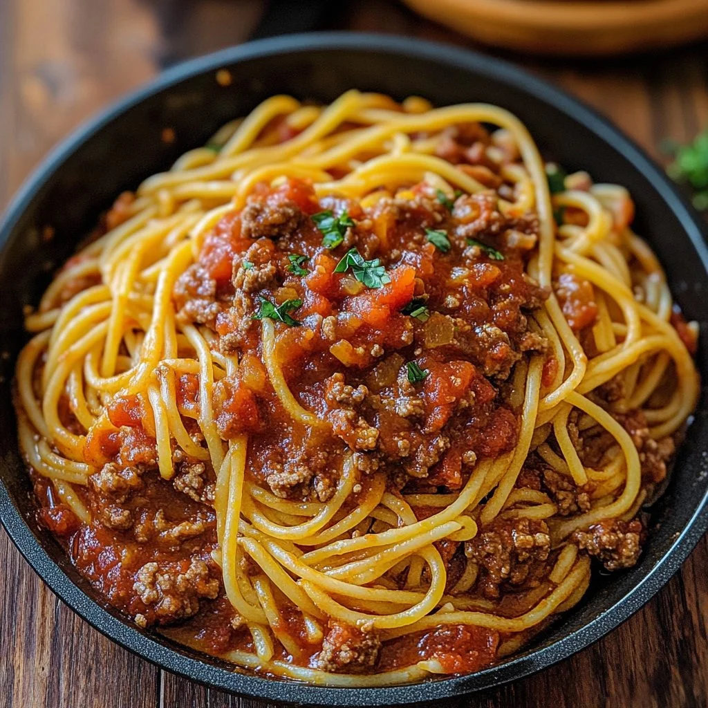A comforting one pot dish that blends the savory flavors of ground beef, Italian sausage, and crispy bacon with spaghetti, creating a perfect meal for busy weeknights or cozy gatherings.