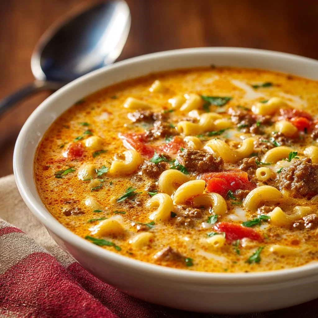 A hearty and comforting macaroni soup combining ground beef, creamy cheddar cheese, and elbow macaroni, perfect for family dinners.