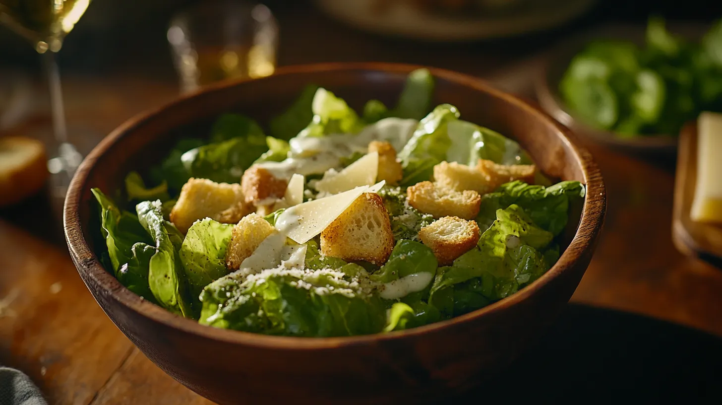Authentic Caesar salad with homemade dressing, crisp romaine lettuce, and crunchy croutons