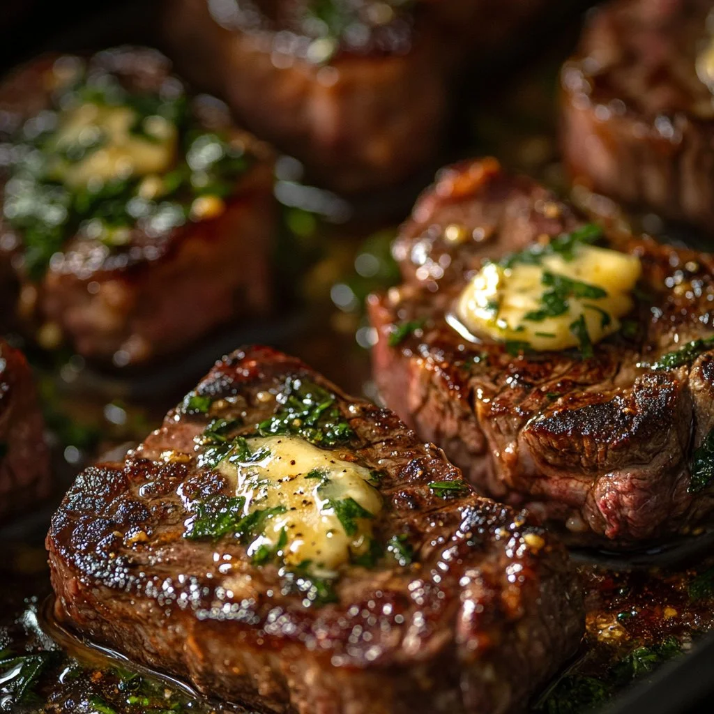 Savor the rich flavors of perfectly pan-seared ribeye steaks topped with a luscious garlic butter sauce, ideal for a memorable meal.