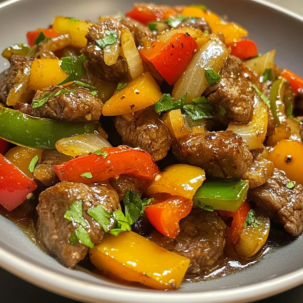 A delightful pepper steak dish featuring tender beef sirloin, vibrant bell peppers, and sweet onions, perfect for family gatherings and weeknight dinners.