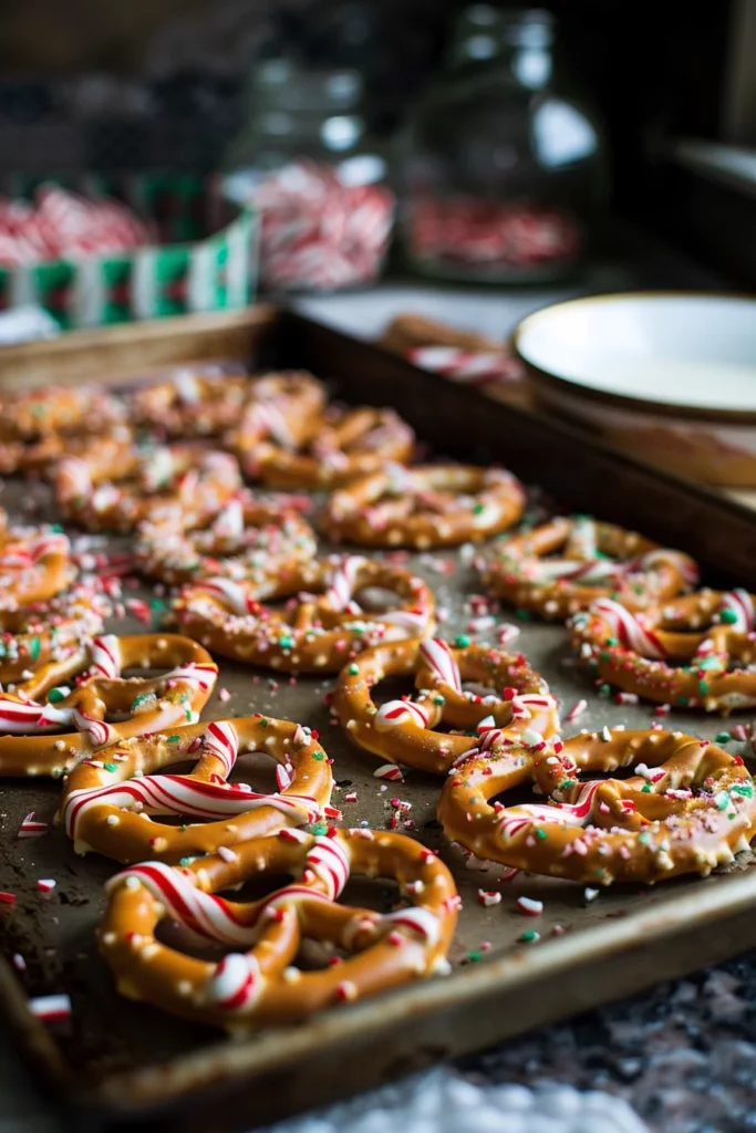 Keywords: pretzel chocolate, candy cane pretzels, holiday treats, chocolate covered pretzels, festive dessert, sweet and salty snacks