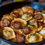 A comforting Perogies and Sausage Skillet, perfect for autumn. This hearty dish features crispy perogies and savory sausage, ideal for sharing with loved ones.