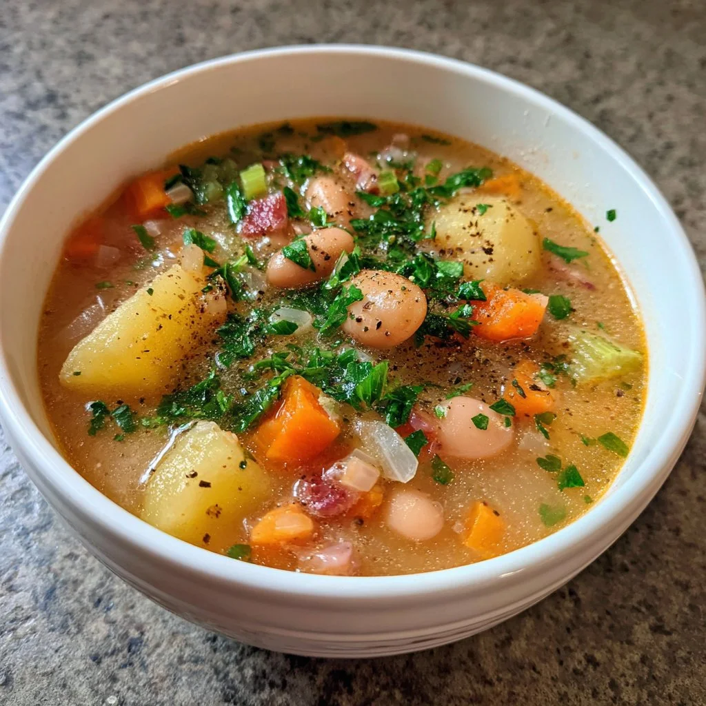 A comforting and hearty potato and bean soup that brings warmth and joy to any dining table.