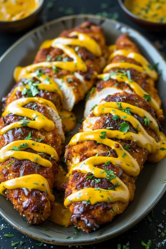 Presentation plays a significant role in the overall dining experience. Arrange the pretzel chicken on a platter, drizzled generously with the mustard cheddar sauce. Garnishing with fresh herbs, such as parsley or chives, adds a pop of color and freshness.