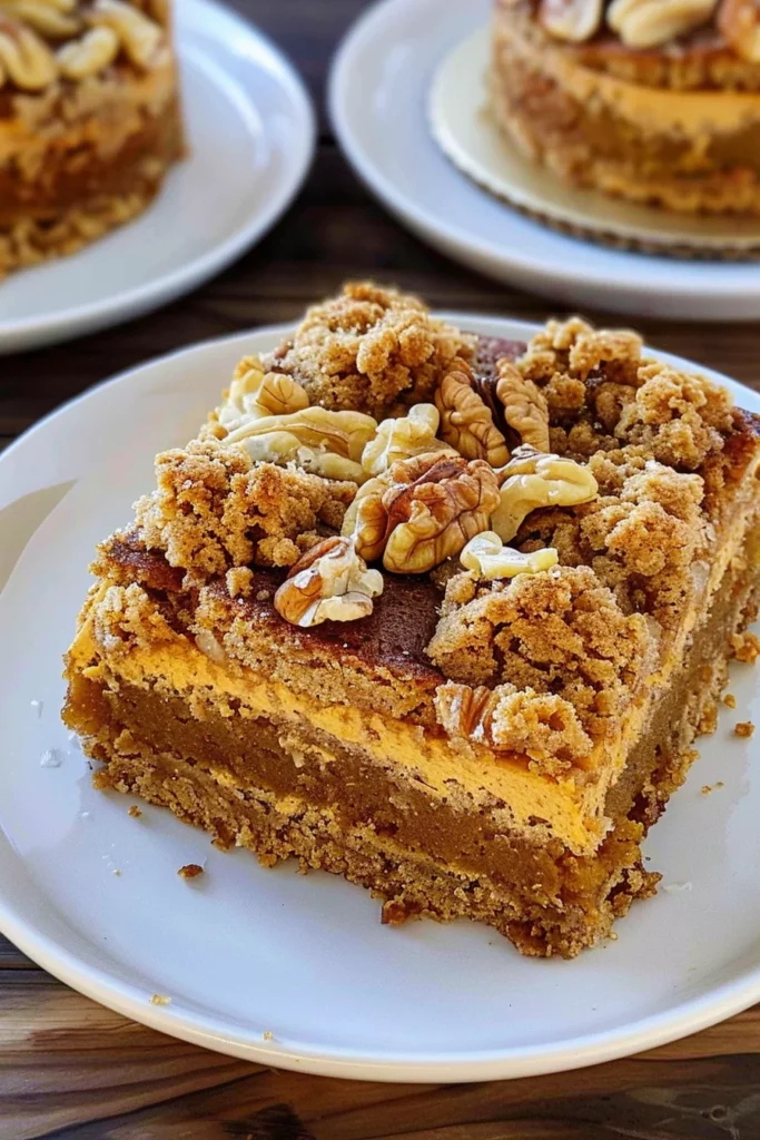 - For the topping: Mix the reserved cake mix with the sugar and softened butter until it forms a crumbly texture. Sprinkle this over the pumpkin layer, then evenly distribute the chopped walnuts on top.