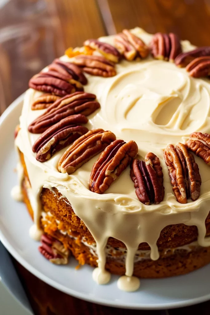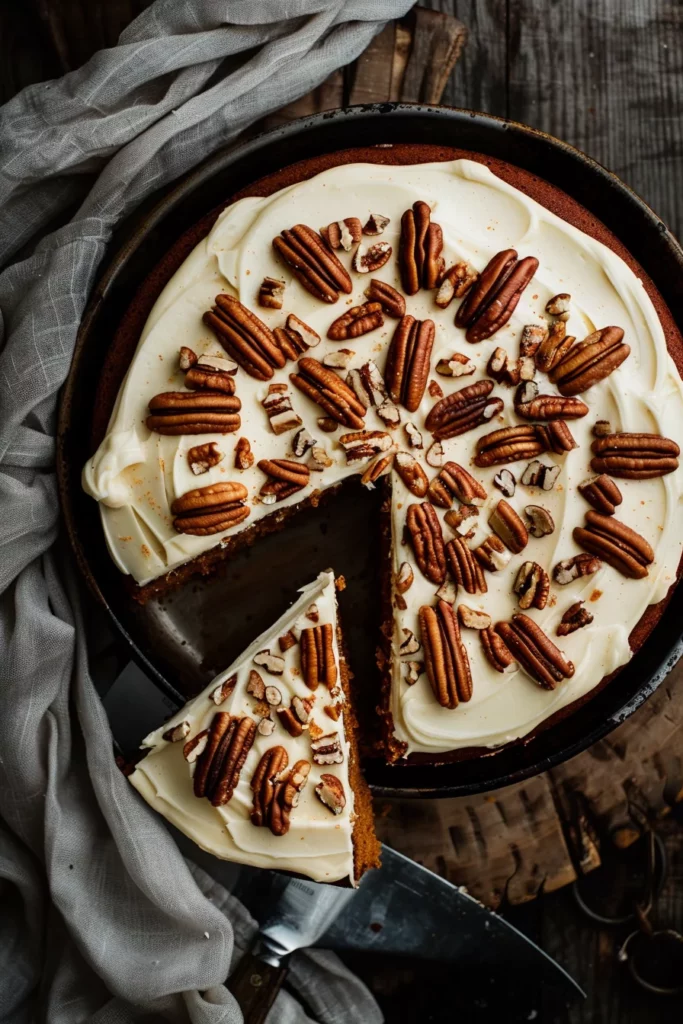 For an elegant touch, serve on a cake stand or a rustic wooden board. The contrasting textures and colors of the cake, frosting, and pecans make for a stunning display. Pairing the cake with a warm cup of tea or coffee enhances the experience, making it a perfect treat for gatherings.