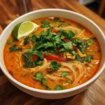 A warm and comforting bowl of Red Curry Noodle Soup that combines rich red curry paste, creamy coconut milk, and fresh herbs for a delightful experience.