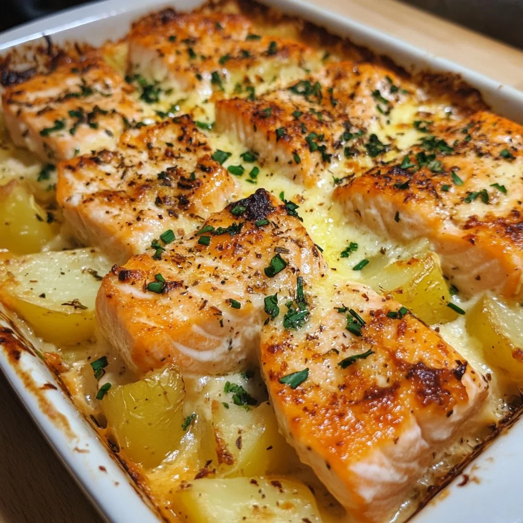 A comforting and flavorful dish featuring tender salmon fillets layered with sliced potatoes and rich heavy cream.