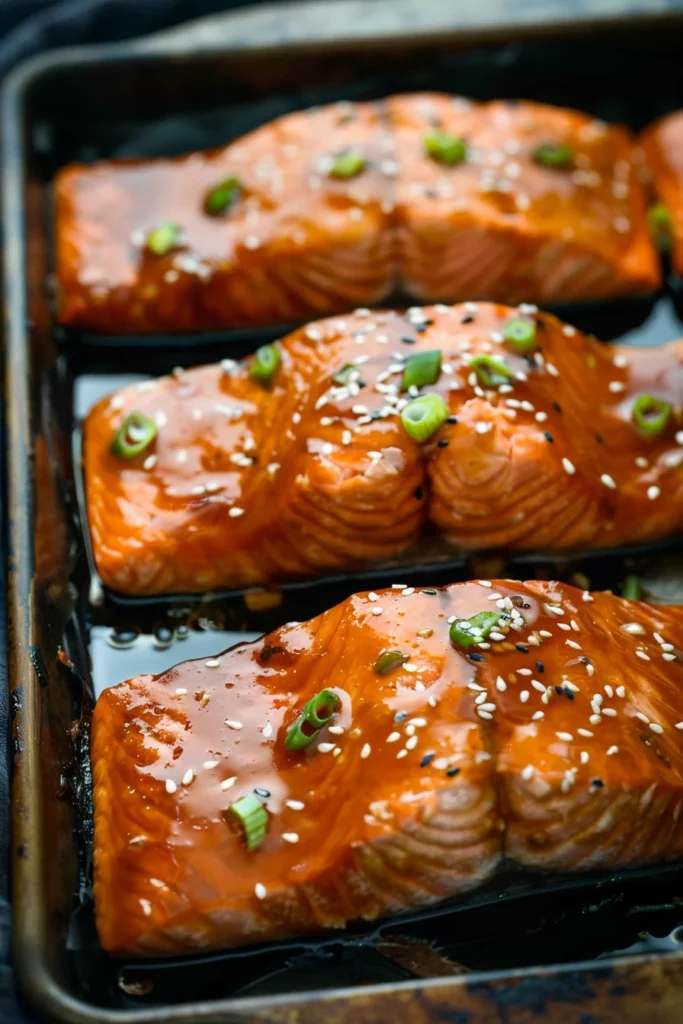 - After removing the salmon from the oven, brush it with the thickened teriyaki mixture, then, if desired, sprinkle with chopped green onions and sesame seeds.