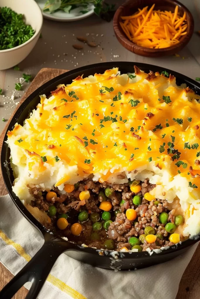 Keywords: shepherd’s pie recipe, mashed potatoes, ground beef, skillet meal, comfort food, cheesy topping