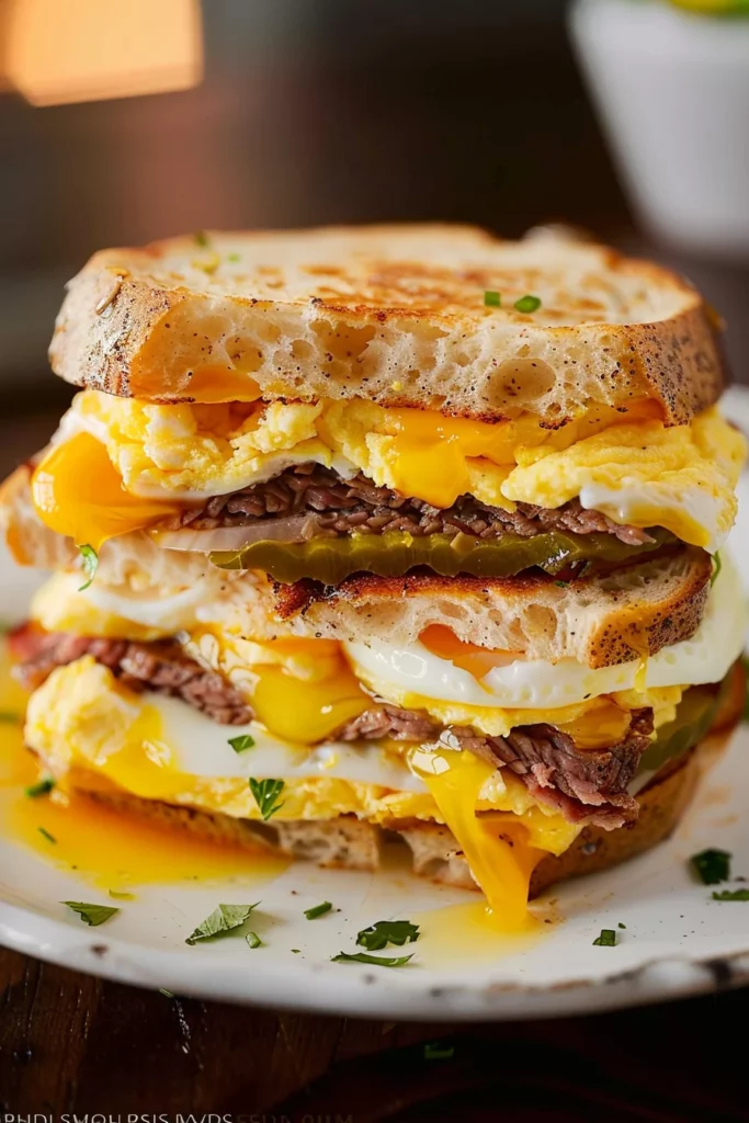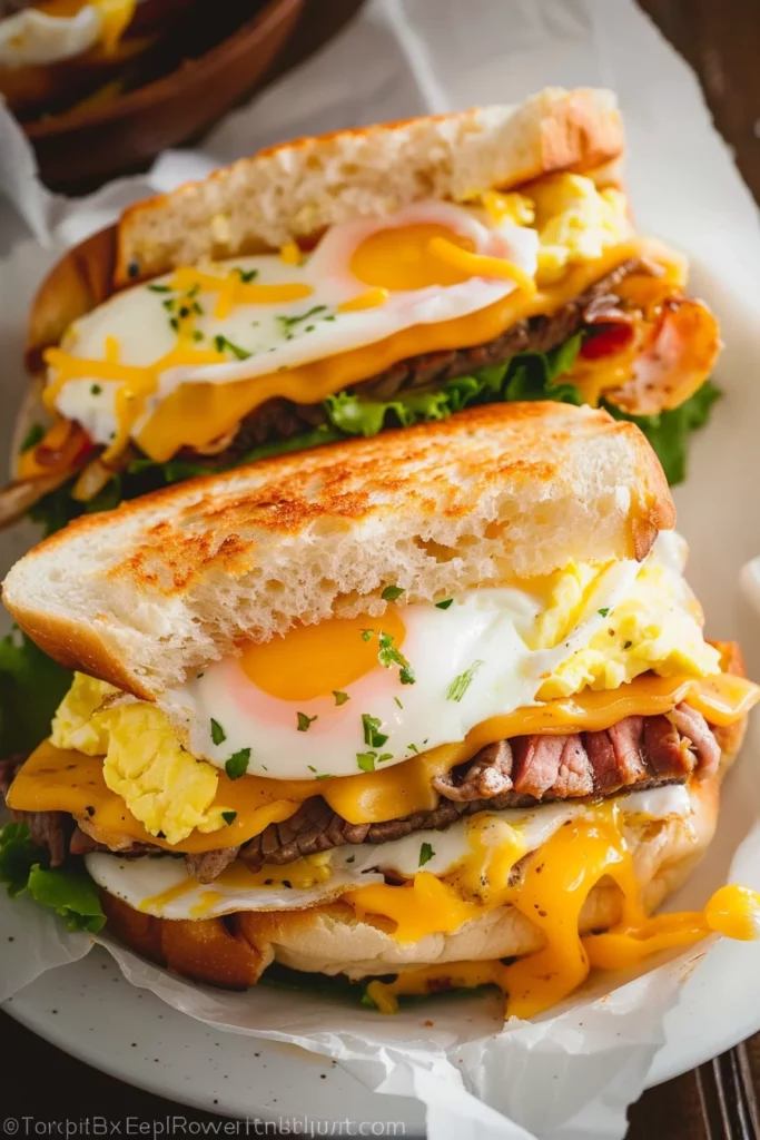 Achieving the perfect breakfast sandwich is all about attention to detail. Ensure that each component is cooked to its optimal level, balancing the taste and texture of the eggs, cheese, and beef. The beef slices should be tender and flavorful, complementing the richness of the eggs and cheese.