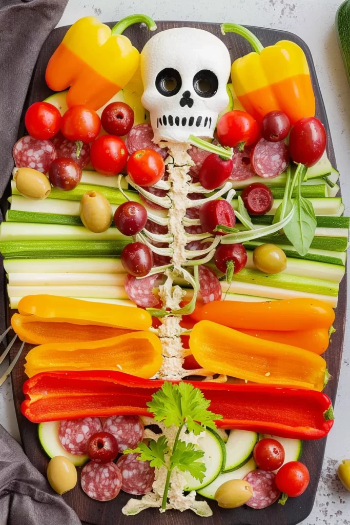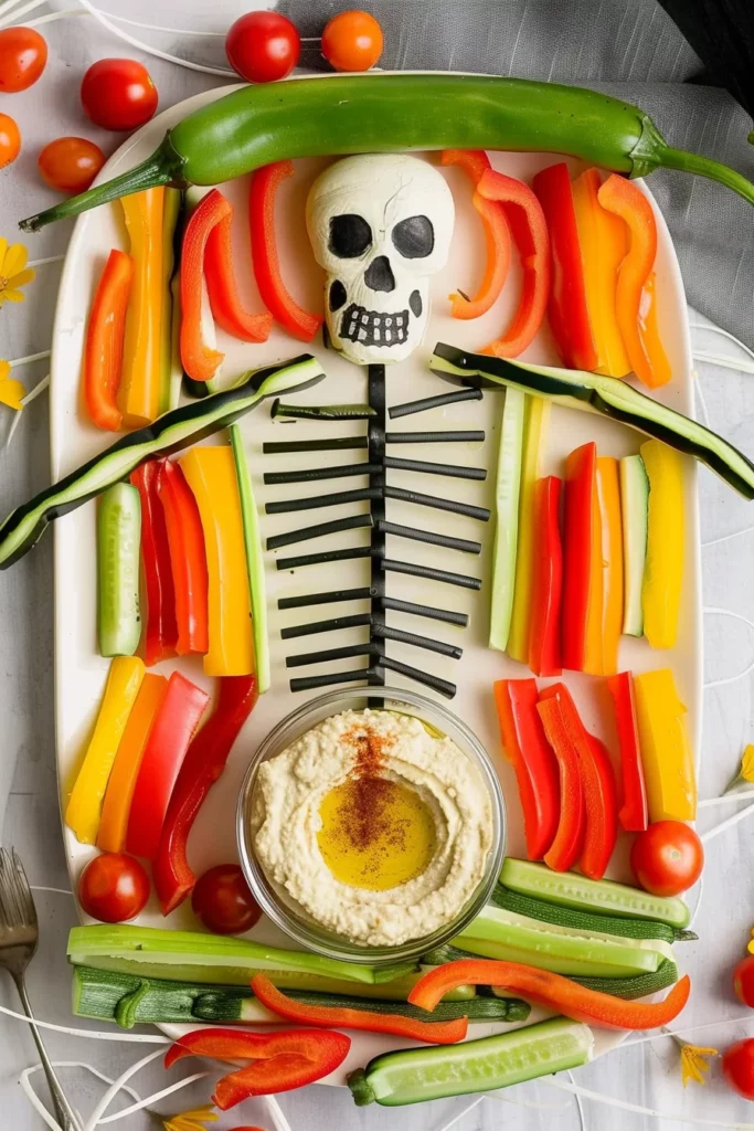 Keywords: – vegetable skeleton, colorful ribs, – hummus dip, skeleton platter, – bell pepper ribs, carrot hands, – tomato joints, olive eyes, – zucchini spine, celery arms