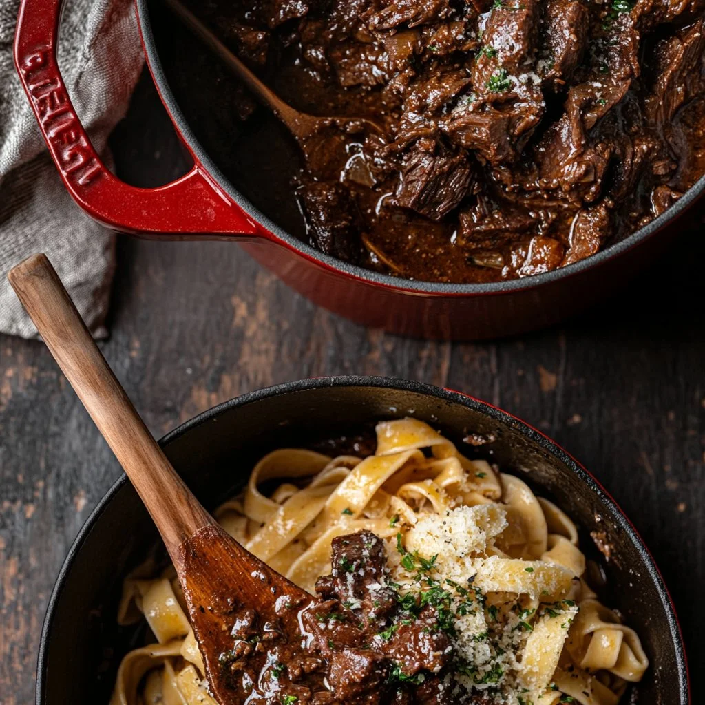 A rich and savory slow-cooked short rib ragù, perfect for pasta or polenta, evoking the warmth of family gatherings.