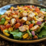 A vibrant and flavorful salad featuring grilled chicken, black beans, sweet corn, and fresh vegetables, drizzled with a zesty chipotle-lime dressing.