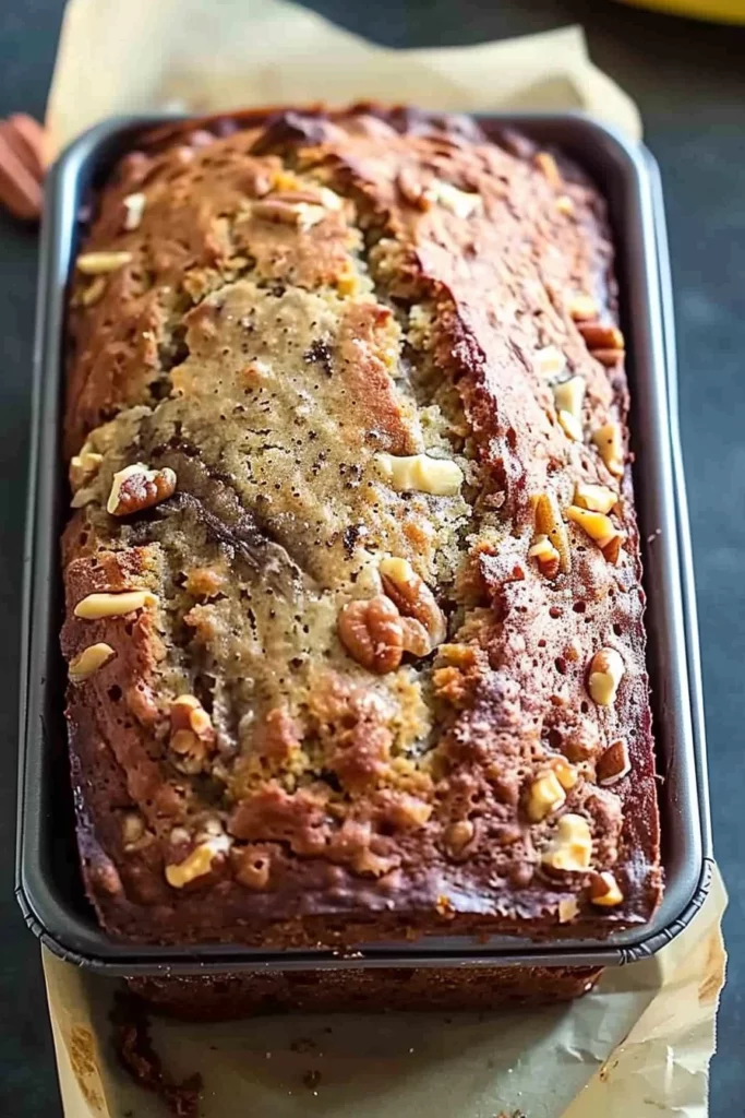 Keywords: banana bread recipe, ripe bananas, baking instructions, walnut topping, moist loaf, homemade baking