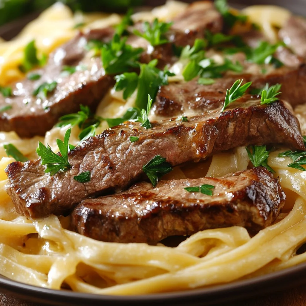 Indulgent creamy pasta dish featuring tender steak and rich Parmesan Alfredo sauce.