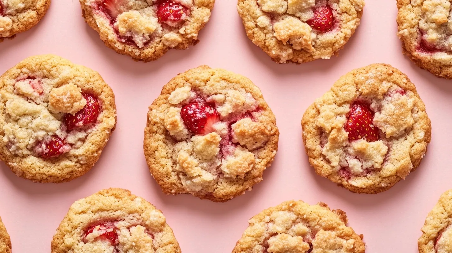 Delicious cookies featuring freeze-dried strawberries with crisp edges and tender centers, topped with a distinctive crunchy topping.