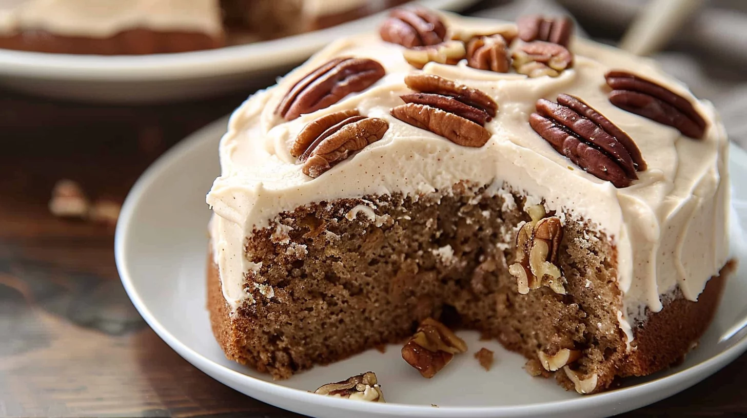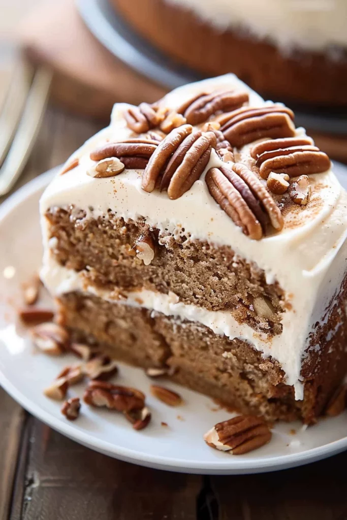 Keywords: all-purpose flour cake, applesauce cake recipe, cinnamon spice cake, cream cheese frosting, toasted pecans topping, nutmeg spiced cake