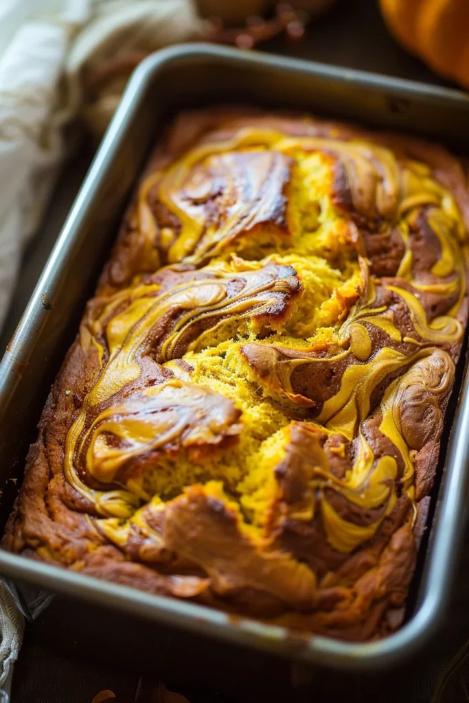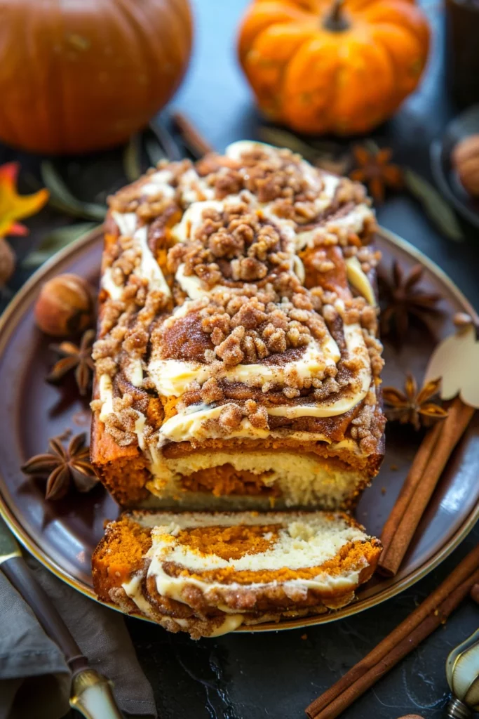 Keywords: pumpkin bread, cream cheese swirl, streusel topping, fall dessert, easy baking, moist loaf