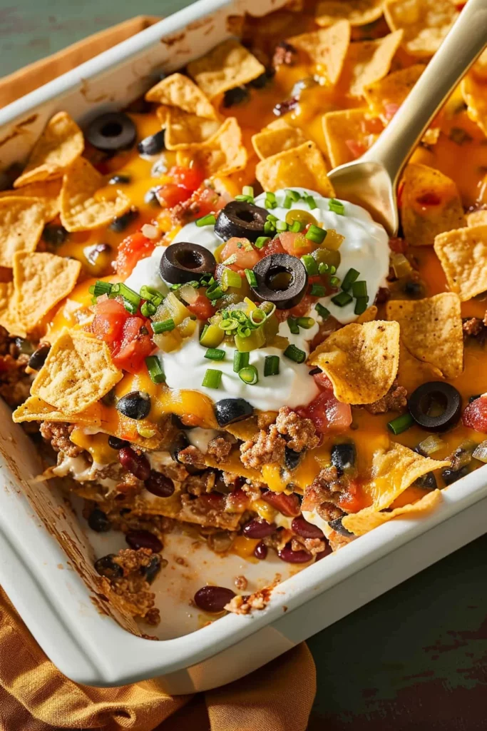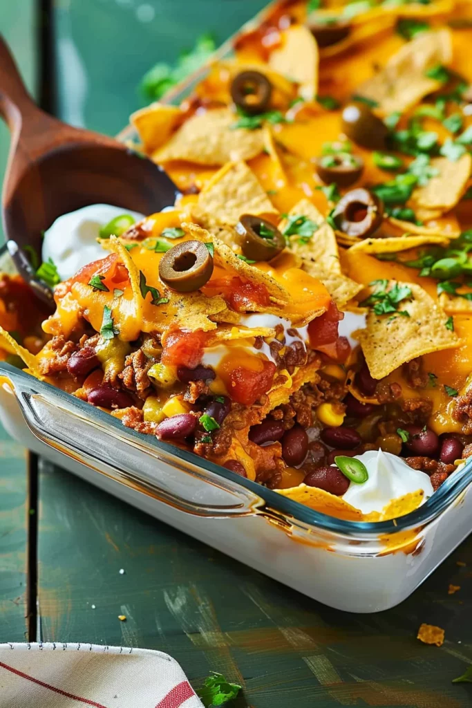 Layering is a crucial technique in preparing Taco Casserole. Begin by spreading crushed tortilla chips evenly in the baking dish. This creates a crunchy base that adds texture to every bite. Pour the beef mixture over the chips, ensuring an even distribution for consistent flavor throughout the casserole. Spread plain yogurt over the beef layer, followed by a generous topping of black olives and shredded cheese.