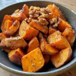 A comforting dish of sweet potatoes roasted with maple syrup and crunchy walnuts, perfect for any occasion.