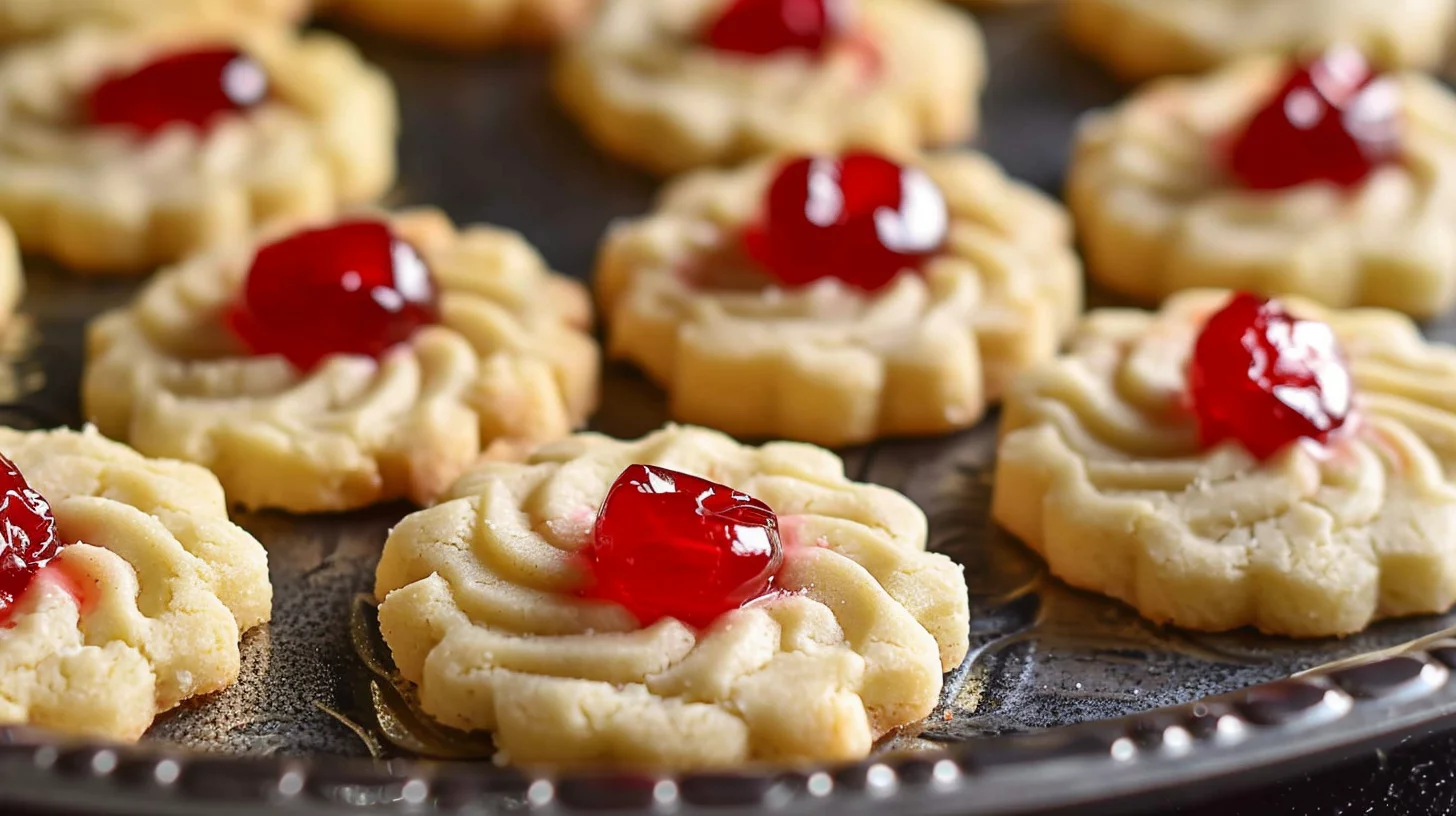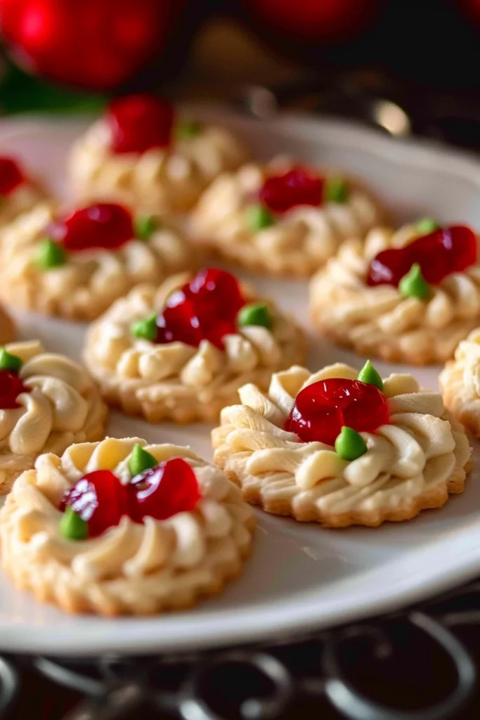 Whipped shortbread cookies are perfect for any occasion, from casual gatherings to festive celebrations. Arrange them on a platter with a mix of red and green maraschino cherries for a visually appealing presentation. Their delicate texture and rich flavor make them a crowd-pleaser.
