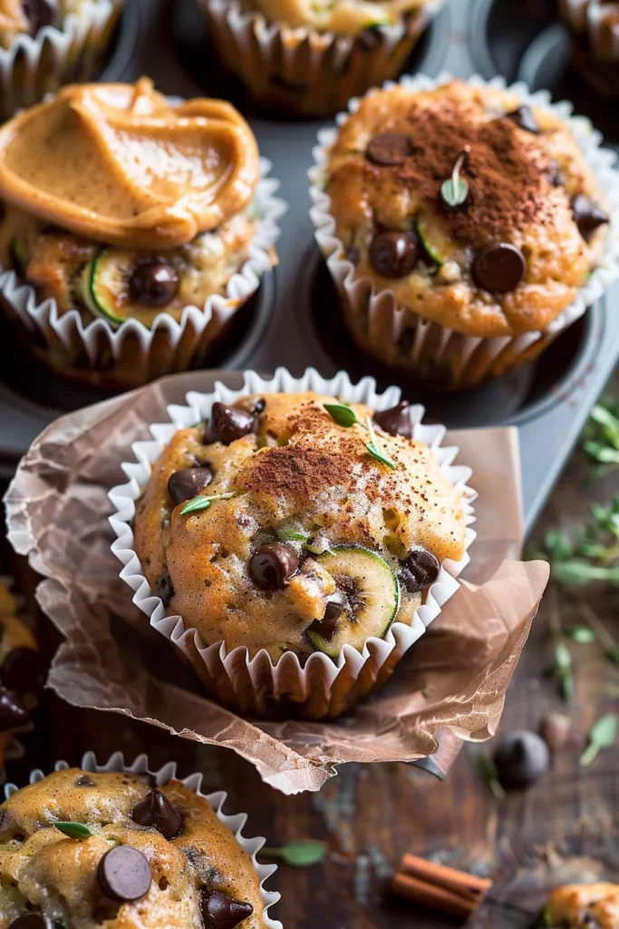 Serve your Wholesome Chocolate Chip Banana Zucchini Muffins For Fall warm or at room temperature. For an extra special touch, prepare a cinnamon spread by blending coconut oil, apple juice, and cinnamon. Spread this mixture on the muffins just before serving to elevate their flavor profile and add a hint of spice.