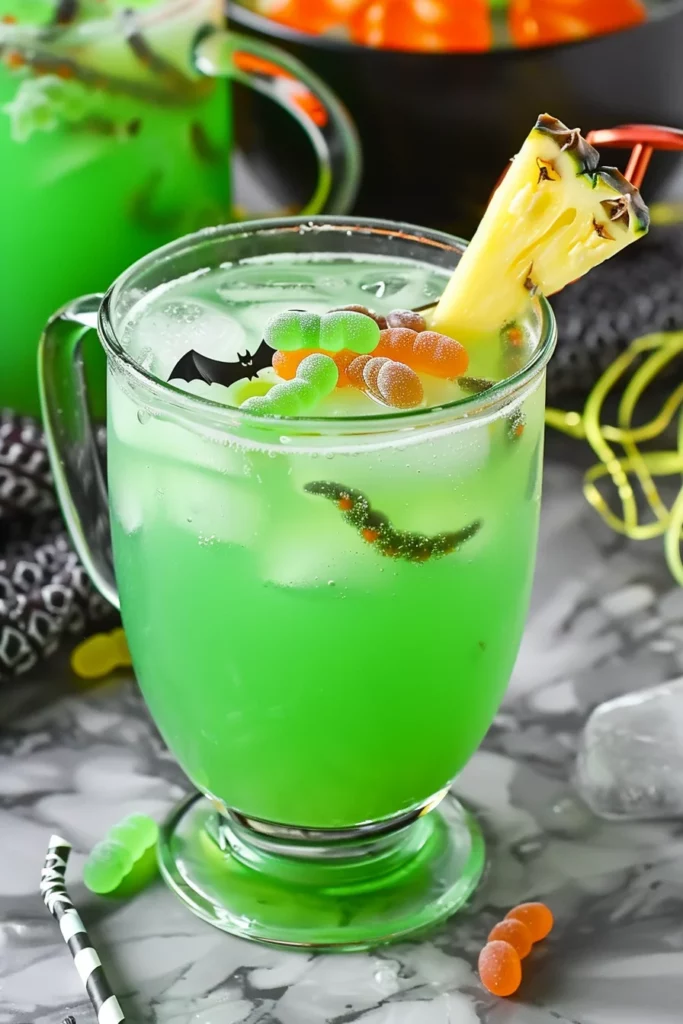 Keywords: witch’s brew punch recipe, spooky Halloween punch, gummy worm punch, lime sherbet punch, pineapple soda punch, creepy crawly punch