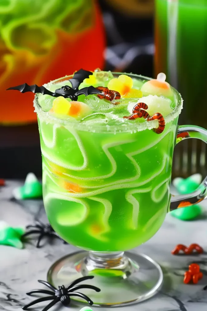 To achieve the iconic green color, a few drops of green gel food coloring are essential. This vibrant hue is what gives the punch its witchy allure, transforming the drink into a magical potion. The gummy worms and plastic spiders play a dual role as both garnish and thematic embellishment, adding a playful element to the punch.