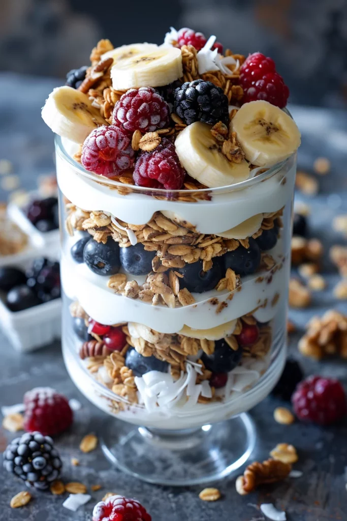 - Repeat the layers with remaining yogurt, granola, banana, and berries.
