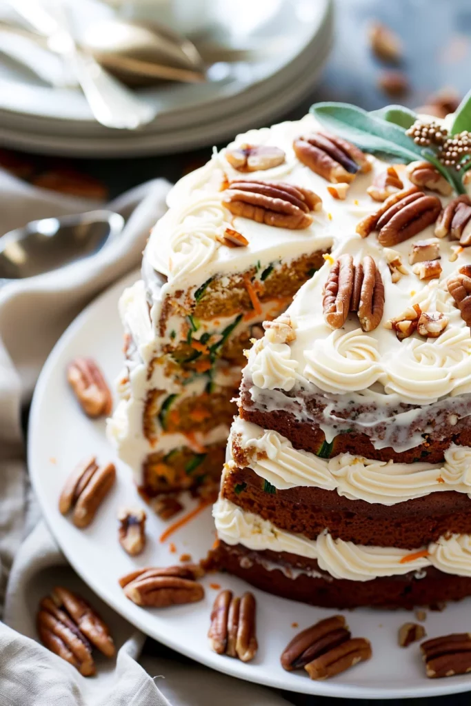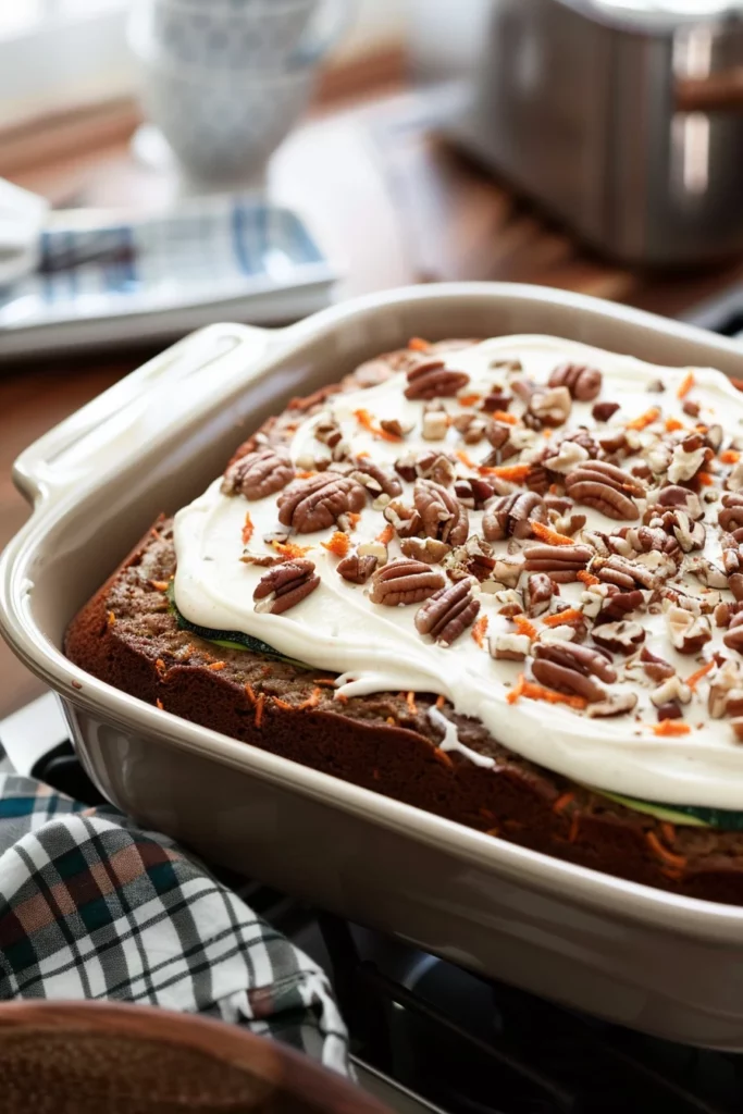 Keywords: zucchini cake, carrot cake, cream cheese frosting, nut garnish, moist cake, spice cake